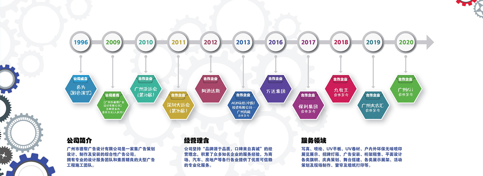廣州市德幫廣告設計有限公司,是一家集廣告策劃 、設計及制作安裝于一體的綜合性廣告服務商,公司(原彩色演藝噴繪)成立于1996年,公司擁有惠普、愛普生戶內外寫真噴繪機20臺,HP latex環保乳膠墨水打印機2臺,大噴機10臺,UV平板卷材機6臺,全自動智能切割機4臺等高端設備,專業的設計制作團隊和素質精良的大型廣告工程施工團隊,廠房面積達3000平米。公司主要經營戶內、外寫真、噴繪、廣告工程的制作、平面設計、燈箱、招牌等業務,公司所有的設備采用進口設備、后期制作自動化,生產速度快、質量第一。與方圓地產、萬達廣場、招商地產、萬科地產合作,主要制作內容:廣告活動物料、圍墻的生產、安裝、桁架的搭建、活動執行、高空安裝、燈旗的制作及安裝等業務。公司先后榮獲廣州地區十佳廣告工程制作公司、中國商務廣告協會廣告工程分會會員單位、全國噴繪企業入圍品牌公司等諸多榮譽。至今已發展成為華南地區大型的廣告產品供應基地。并以“產量高、質量好、交貨快”的經營模式贏得了廣大客戶的稱贊。并堅持“品牌源于品質,口碑來自真誠”的經營理念,積累了眾多知名企業、政府機構的服務經驗,為大型活動、商場超市、汽車、房地產等各行業提供了優質可靠的專業化廣告服務。旨在協助客戶提升品牌形象,并以建立長期品牌價值為使命,讓各行業的品牌形象結合產品推向市場,贏得足夠的社會關注,幫助企業品牌成長。